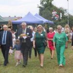 Naszą uroczystość otworzył barwny korowód, który wyruszył spod siedziby Urzędu Gminy na miejsce uroczystości czyli boisko sportowe. W rytm melodii granych przez niezawodny „Listek Koniczyny” kroczyli Starostowie Dożynek – Państwo Małgorzata i Józef Kapinos, przedstawiciele władz samorządowych i poszczególnych sołectw niosący nieodzowne atrybuty dożynek, jakim są wieńce dożynkowe. Misterne, przepiękne wieńce, zgodnie z wielowiekową tradycją, nawiązywały do regaliów królewskich – zwłaszcza korony. Po raz kolejny jesteśmy pod wielkim wrażeniem kunsztu i pomysłowości w wykonywaniu wieńców. Nie wiemy jak to się dzieje – ale z roku na rok, są coraz piękniejsze!
