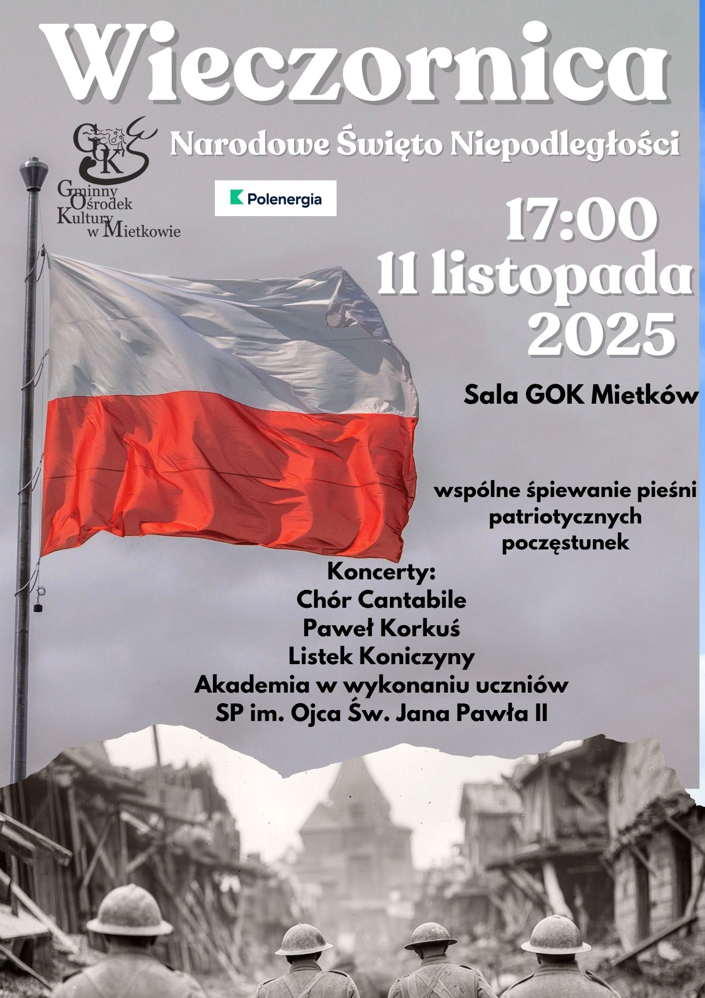 Gminny Ośrodek Kultury w Mietkowie już w najbliższą sobotę wprowadzi nas w obchody Narodowego Święta Niepodległości zapraszając serdecznie wszystkich mieszkańców na Koncert Patriotyczny, który odbędzie się 8 listopada 2025 r. o godz. 11:00 w sali GOK Mietków. Wystąpi Koło Muzyczne GOK pod przewodnictwem Iwony i Piotra Leroch.