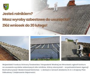 Informujemy, iż Wojewódzki Fundusz Ochrony Środowiska i Gospodarki Wodnej we Wrocławiu ogłosił konkurs na usuwanie wyrobów azbestowych dla rolników, którzy skorzystali – za pośrednictwem Agencja Restrukturyzacji i Modernizacji Rolnictwa – z dotacji w ramach działania A1.4.1 z Krajowy Plan Odbudowy i Zwiększania Odporności.