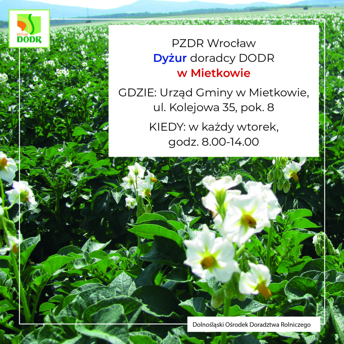 Z radością informujemy, że w każdy wtorek w godzinach 8:00 – 14:00 w Urzędzie Gminy Mietków – pokój nr 8 odbywać się będą dyżury dla rolników, prowadzone przez doradcę z