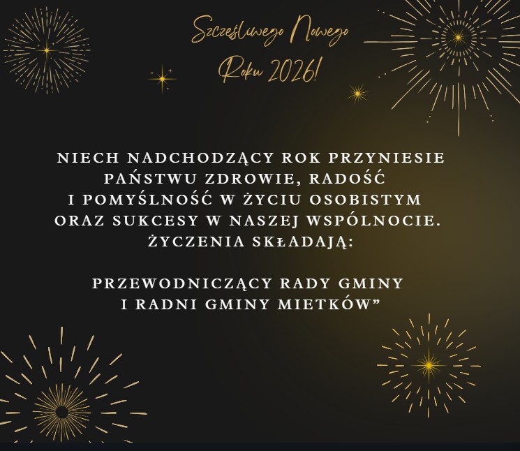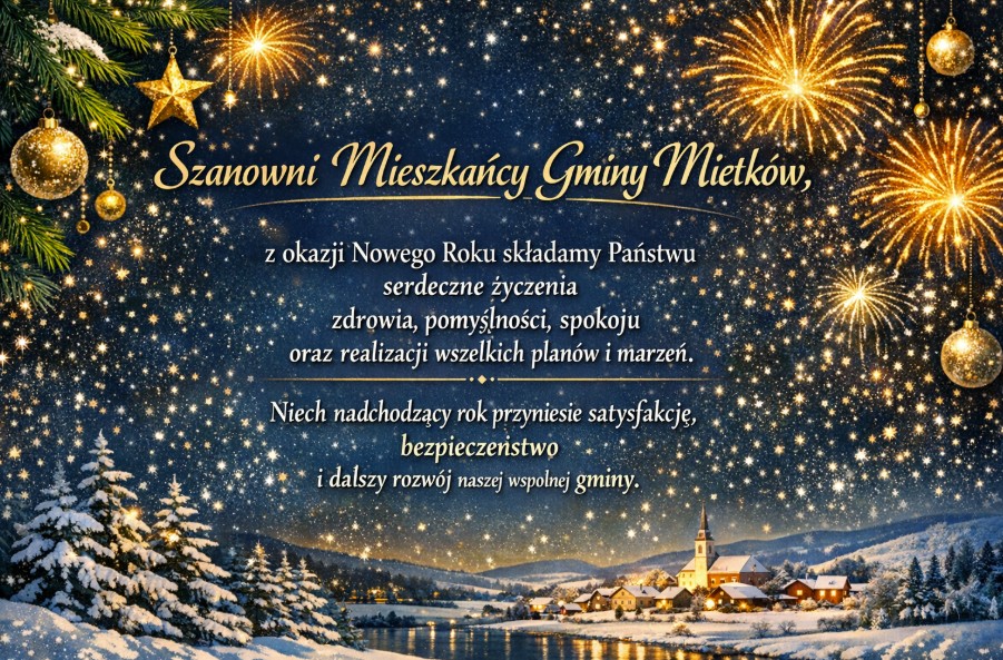 Szanowni Mieszkańcy,uprzejmie informujemy, że w dniu 31 grudnia 2025 Urząd Gminy Mietków będzie czynny w godzinach 7:15–13:00. Prosimy o zaplanowanie wizyt w urzędzie w podanych godzinach.Dziękujemy za zrozumienie i życzymy