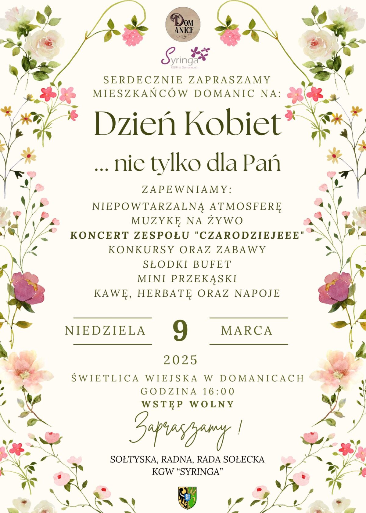 Rada Sołecka, Sołtyska, Radna oraz zespołem Czarodzieje zapraszają na wyjątkowe, niedzielne popołudnie, wypełnione śpiewem, muzyką na żywo, zabawami, pysznym ciastem oraz ciepłą atmosferą mieszkańców Domanic.
