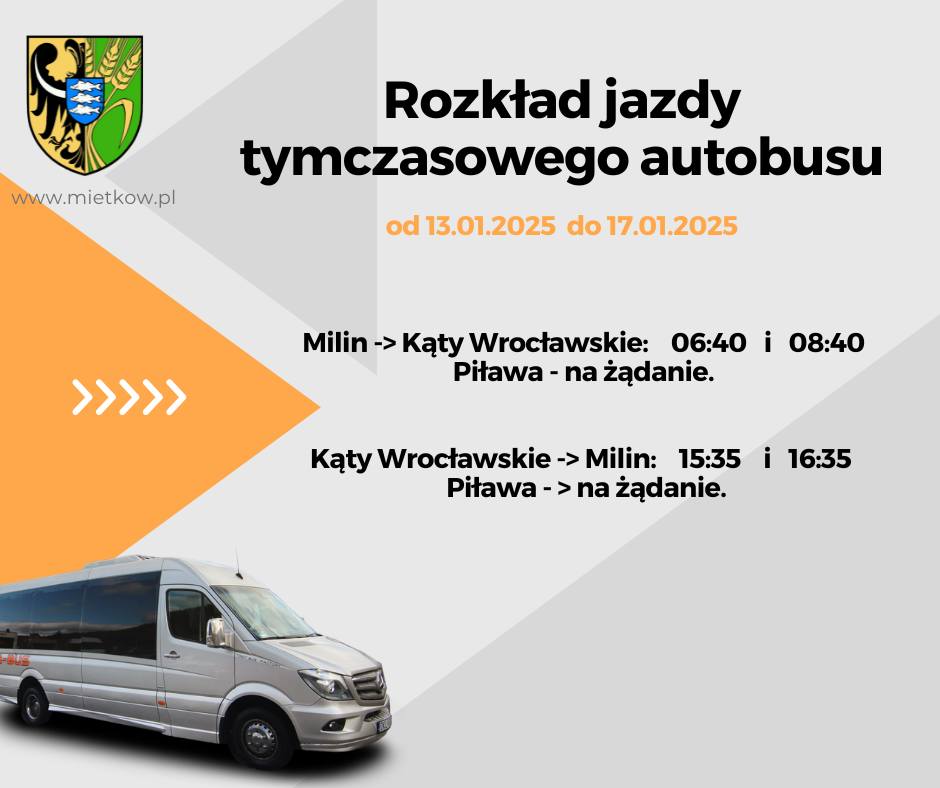 Szanowni Mieszkańcy Zgodnie z obietnicą, że jeśli nie uruchomimy jeszcze stałej linii to zorganizuję tymczasowe połączenie. 2 połączenia rano z Milina, przez Piławę do Kątów w godzinach: 6:40 i 8.40