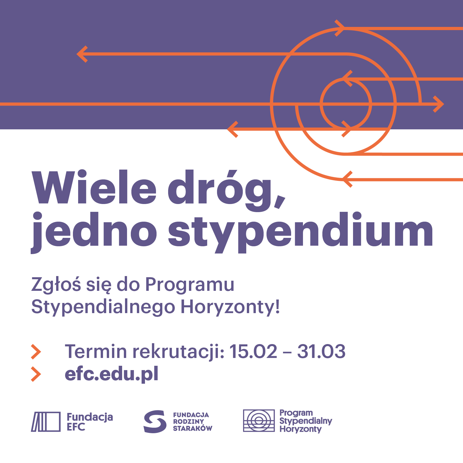 Wiele dróg, jedno stypendium. Pod takim hasłem Fundacja EFC rozpoczęła rekrutację do kolejnej edycji Horyzontów – programu stypendialnego, który już od 12 lat pomaga licealistom i licealistkom w nauce, rozwijaniu pasji oraz mądrym, odpowiedzialnym i szczęśliwym wkraczaniu w dorosłe życie. Zaproszenie kierowane jest do ósmoklasistów, którzy pochodzą z małych miejscowości, a chcieliby dalej uczyć się i rozwijać w wymarzonym liceum lub technikum w dużym mieście. Stypendium otrzymują na cały okres nauki w szkole średniej. Program Stypendialny Horyzonty objął już blisko 900 uczniów szkół ponadpodstawowych. Rekrutacja trwa od 15 lutego do 31 marca 2022 roku – wystarczy wypełnić formularz na stronie https://efc.edu.pl/programy/horyzonty